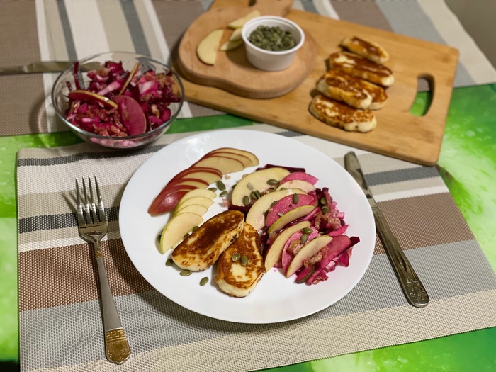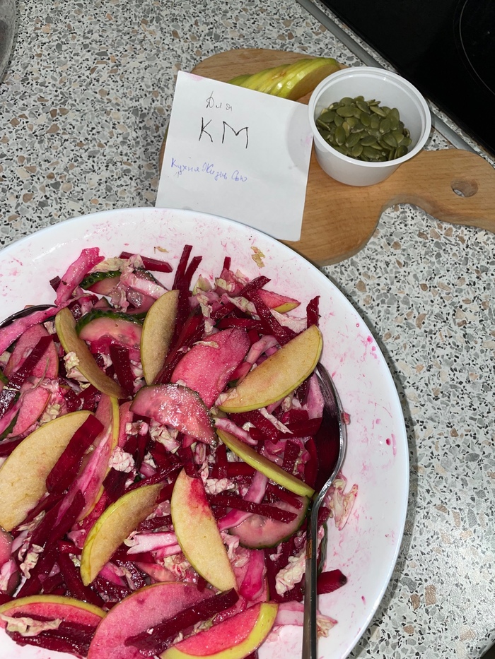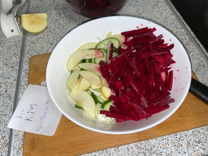 Нашинковать капусту. Нарезать тонкими дольками яблоко и огурец. Закинуть все в большую миску для размешивания. Сцедить свеклу и добавить туда же.
