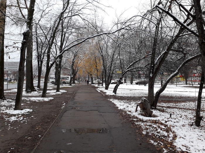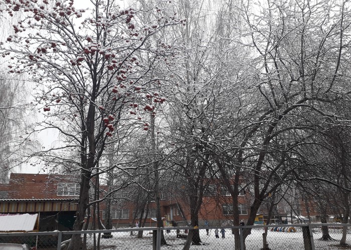 А вообще мне нравится подобное явление, нравятся эти контрасты, графичность природы. Промокшие стволы деревьев ярко выделяются на фоне серых домов и свежего снега :3 Природа застывает..