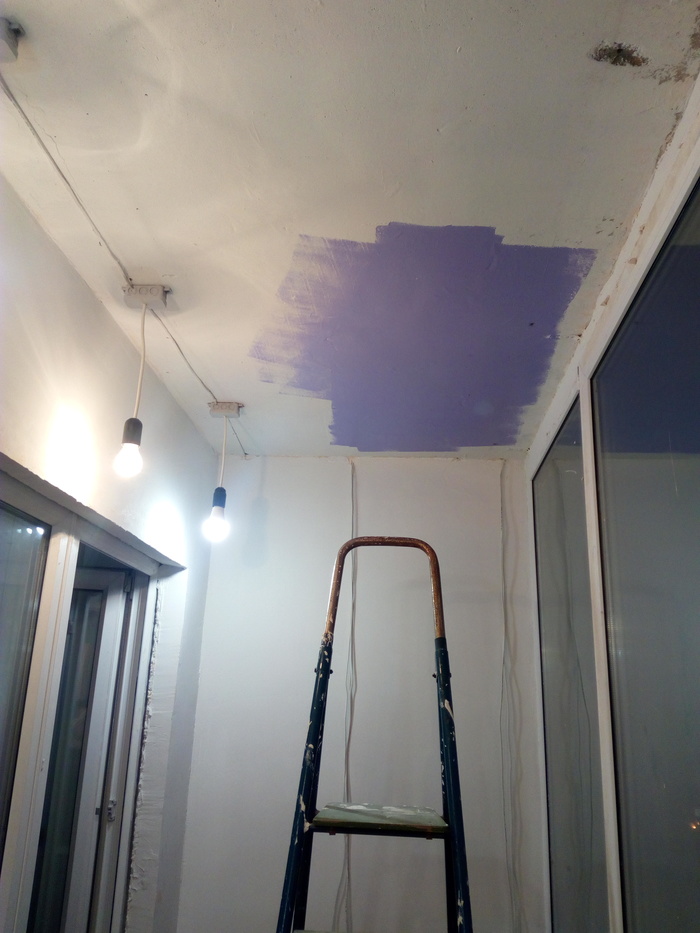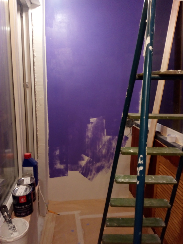 Цвета выбирали с женой не долго, хотели что то между синим и вишневым, выбрали этот назовем его фиолетовым. Решили все покрасить в трех цветах: стены и пол в белый и это фиолетовый, а потолок в слабофиолетовый.