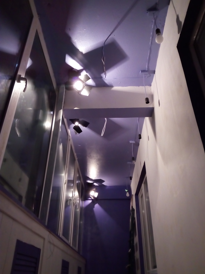 Ряд одиночно висящих патронов предполагали романтичноприглушенное освещение от ретро ламп, которые в итоге так и не купил. А на фото ниже можно увидеть основное освящение пока лежащее на полу.