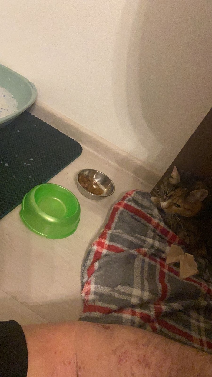 А вот в лоток пока не заметно, что ходила. У неё все стоит рядом. Весь день сидит в коробке, мы её стараемся не тревожить, видно, что боится, но на поглаживания реагирует. Мурлычет и, пока гладят, немного ест».