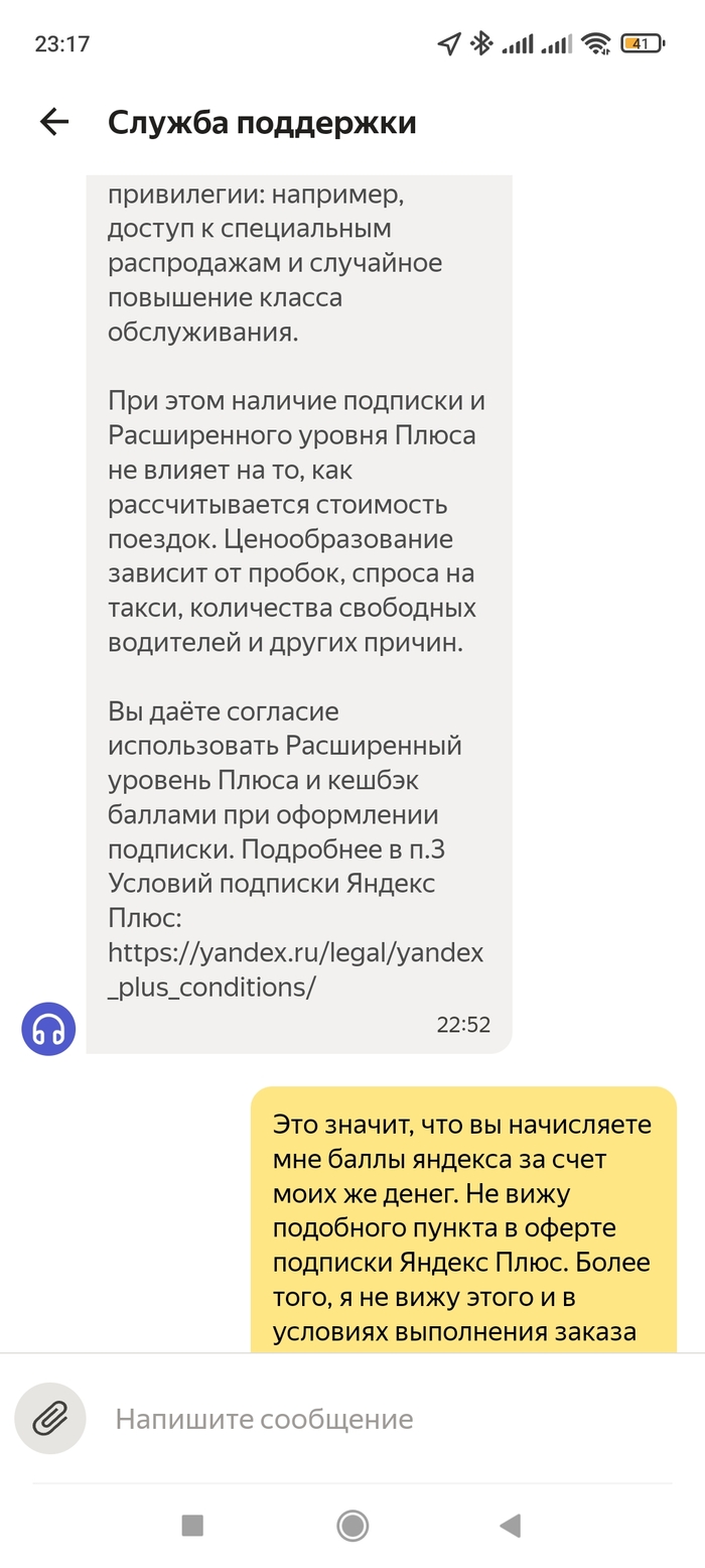 Каково же было мое удивление, что после очередной поездки кроме стоимости самой поездки (1180тг = ок 240р.), они отдельно сняли с карты сумму, равную этим самым баллам, и начислили мне их в Яндекс Плюс. То есть, вместо того, чтобы просто дать мне эти баллы как кэшбек (как было ранее всегда), они просто переносят мои деньги в кабинет Плюса. Спасибо за заботу, конечно, Яндекс, но такого мне не надо. Служба поддержки пытается лепить из меня верблюда. Скрин прилагается.