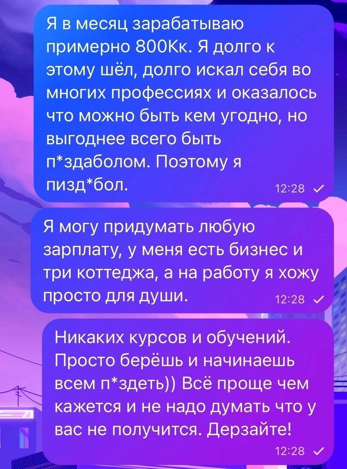 САНЁК (восхищённо): Знатная мамка у тебя. Вот моя меня постоянно шпыняет – иди работай, иди работай. Мне хоть скоро сороковник, но меня так просто не возьмешь. Тратить бесценные годы жизни на просиживание в унылых складах, производственных цехах или пыльных офисах? Да я себя ни на помойке нашёл. Жить надо ярко, легко, непринуждённо! Ведь это же так просто. Неужели это так сложно понять? Ведь мудрые же должны быть наши старики, а они какие-то наоборот бестолковые.