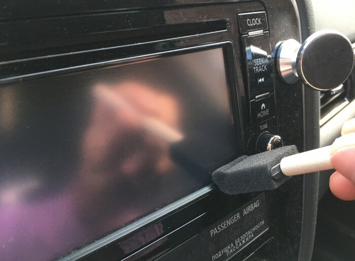Кроме этого, что мне понравилось этой штукой делать, так это чистить дисплей магнитолы. Думаю, те, кто пытался это сделать, знают, как сложно убрать пыль по самой его кромке, т.к., часто, экран несколько утоплен в корпус и надо сильно постараться, чтобы из получающегося углубления (например, уголком тряпки) ее оттуда убрать. Прололнка же, за счет наличия заостренной мягкой кромки, позволяет сделать это без каких-либо проблем.