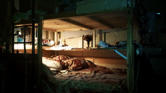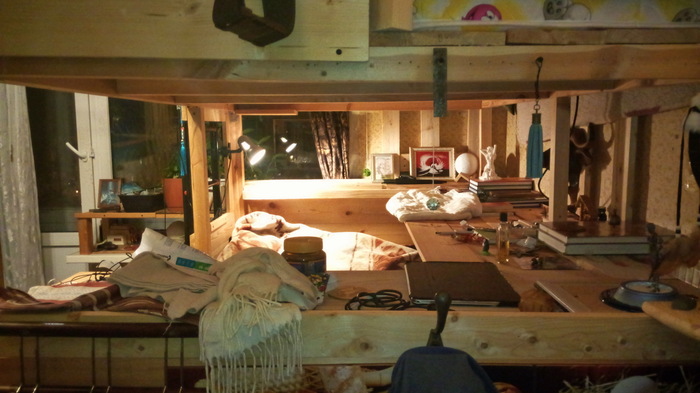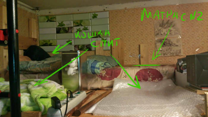 Наверху второй (односпальный) матрас. Хотя в основном там спит кошка.