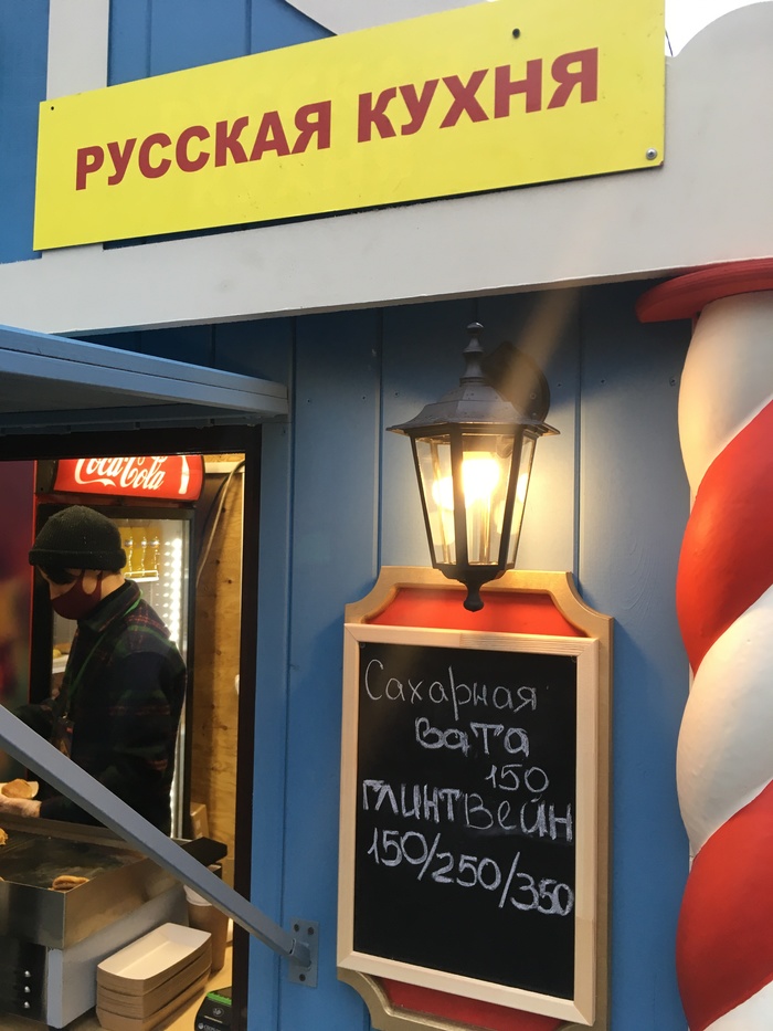 На новогодние праздники в Петербурге, вне дома будет работать только одно развлечение, это рождественская ярмарка. Да, симпатично получилось, но без денег там не интересно, так сделать несколько фото и порадовать детей красочными украшениями. По логике местных властей заразиться вирусом в музее, баре и ресторане гораздо выше чем на переполненной ярмарке, в магазинах и общественном транспорте. Ну, а на фото вы поняли что русская кухня это сладкая вата и глинтвей. Не сбитень, а глинтвейн.