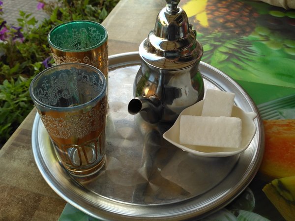 Что могу сказать про марроканский чай... Честно, ничего особого нигде так и не отведал. Просто сильный концентрат мяты, аж горчит. На сахар они не скупятся и очень любят переслащенный чай. Поэтому лучше просить без сахара, но они все равно принесут огромные куски. Кстати, запаситесь простейшим набором фраз на французском - английский не все понимают, а то будут приносить уже заслащенный чай. Вот, оцените размер кусманов сахара: