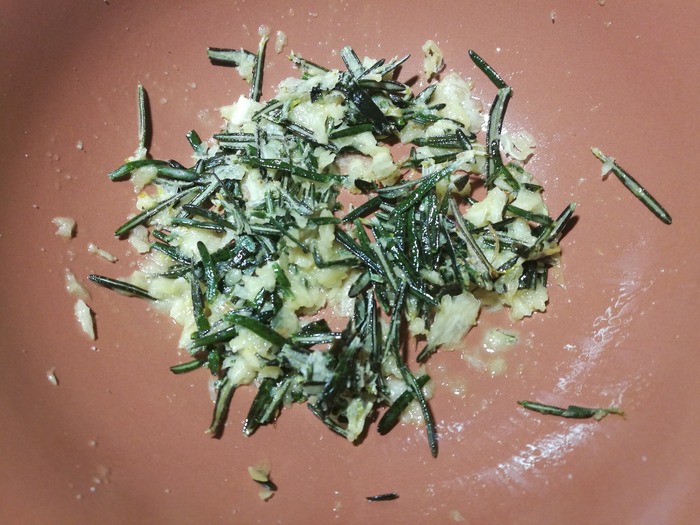 Готовим смесь для маринования. В ступке перетираем чеснок, листья розмарина, винный уксус, острый перец. Добавляем соль и масло. Всё тщательно перемешиваем.
