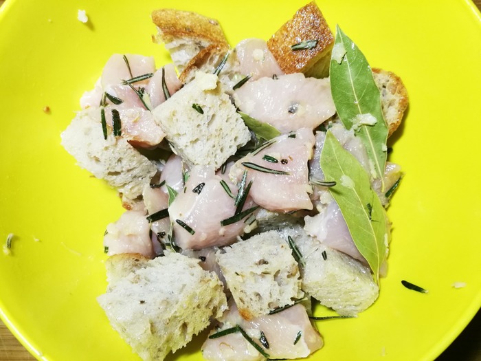 Как время подойдет - отправляем к курице хлеб. Перемешиваем что бы он тоже пропитался чесночно-розмариновой смесью: