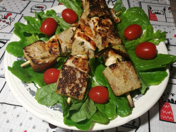 Несколько экспериментальный рецепт куриных шашлычков с хлебным мякишем.Получается довольно необычно. Хорошо подавать с пивом и томатным соусом.