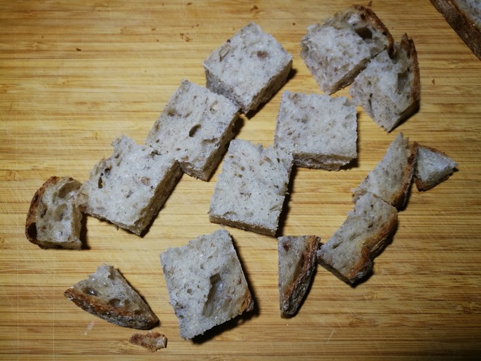 Нарезаем хлеб кусками (размер примерно со спичечный коробок). Понадобится преимущественно куски без корок: