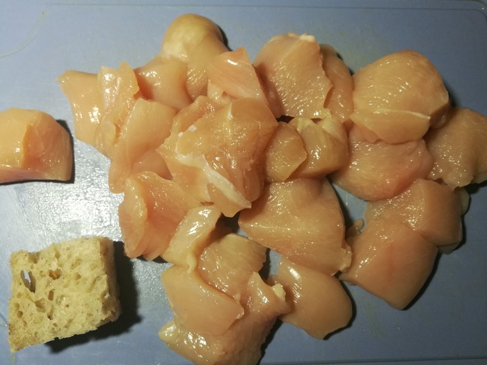 Куриную грудку на небольшие кусочки - примерно как хлеб: