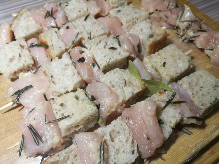 Нанизываем на шпажки поочередно мясо и хлеб: