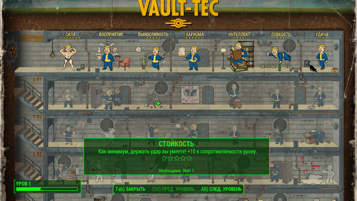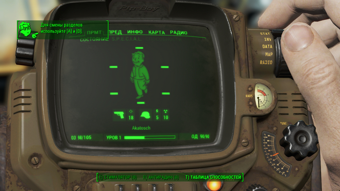 Ну так что, же ещё в геймплее? Ещё в геймплее старый пип-бой, где можно наблюдать все показатели, выбирать способности, или смотреть что носим в своём невидимом рюкзаке