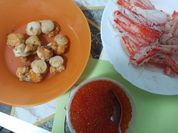 В первый день мы собрали себе скромный набор из икры чавычи, гребешка (тоже с икрой) и конечностей краба.