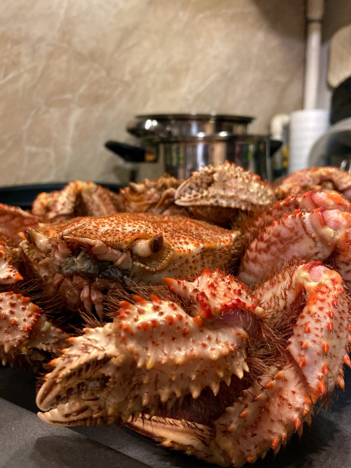 Более того, пускай и уже в Москве, но для себя открыли краба волосатика, который стал достаточно частым гостем на нашем столе. И тоже именно в варианте "тушка с варкой на корабле и последующей шоковой заморозкой".
