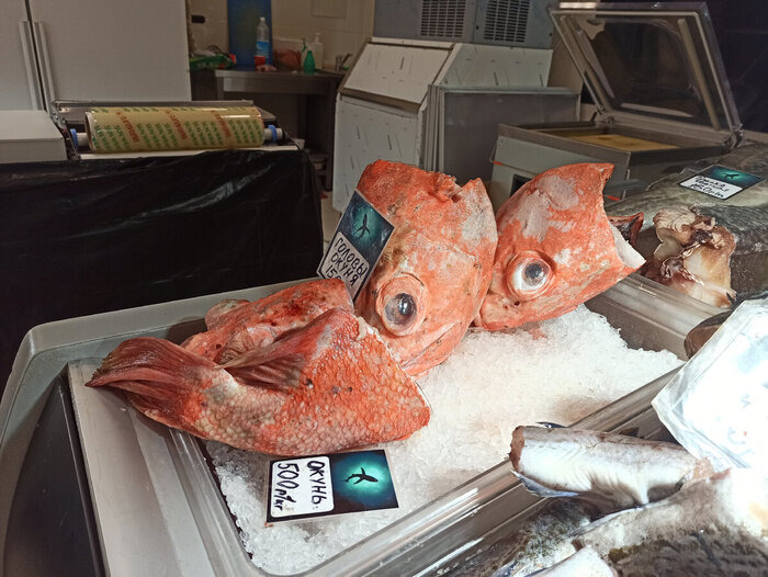 Но основное раздолье в привычных нам морозилках, набитых не такими обыденными продуктами. Когда, например, получится увидеть суповой набор из голов и хвостов огромных морских окуней? В центральной части России они, если и встречаются, то в виде скромных тушек, которым обкромсали всё, что могло бы напугать своим внешним видом слабохарактерного покупателя.