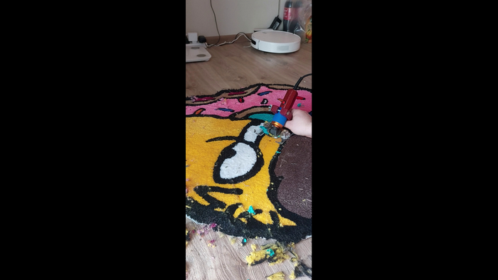 После мы даем сутки времени ковру настоятся и начинаем обработку уже лицевой части, она делится на 2 этапа которые я называю грубая и нежная. Первый этап заключается в том что с помощью машинки для стрижки овец мы подрезаем все под один уровень что бы пряжа не топорщилась. Второй - мы уже все это аккуратненько машинкой для стрижки мелкого безрого домашнего скота и подставки что бы держать все в одном уровне приводим в цивильное состояние.