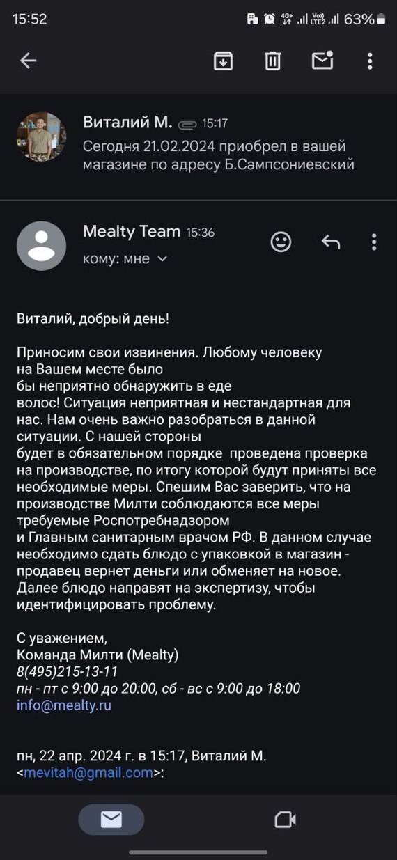 Давно не встречался с таким низким уровнем сервиса. Купил в магазине «Милти» сырничков на обед, а там волосы…Бе..Фу.. Написал в службу поддержки Милти и….Ничего) Отправили меня в магазин – оформляйте возврат там. Видимо для них это норма - идти с распакованной упаковкой сырников по улице, чтобы сообщить в магазине о необходимости возврата денег в то время, как все факты налицо и все можно оформить без визитов. Так еще и про упаковку пишут – я ее еще и сохранить должен был. Да уж, разбаловал меня в этом плане Вкусвилл – всегда все компенсируют без проблем. Не рекомендую пользоваться этим сервисом еды: готовят так себе, а сервис еще хуже. Цена репутации – 180 рублей.)