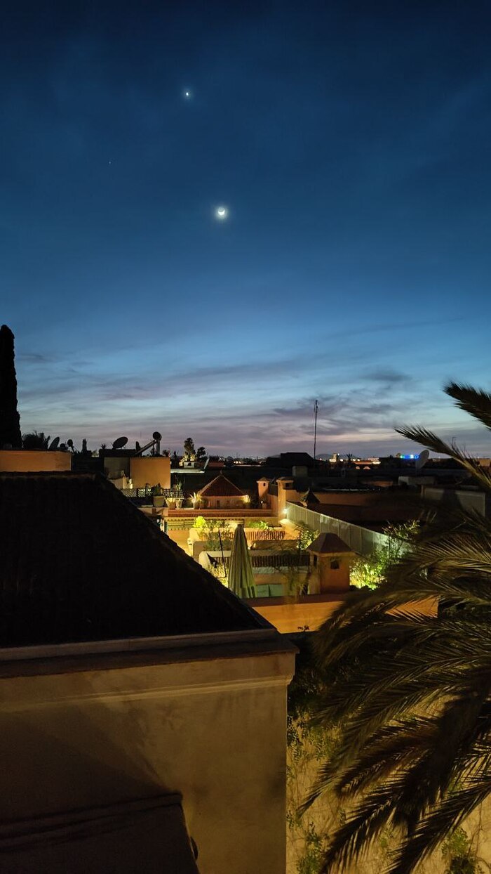 Первый вечер прошёл в аккуратном знакомстве с местным колоритом. Из-за того, что прилетели в рамадан, возник интересный момент. На часы мы особо не смотрели и просто пошли гулять как отдохнули. Мы шли по улочкам медины Марракеша и замечали, что людей становится всё меньше. Зайдя в одно кафе, т.к очень хотелось перекусить, мы поднялись на второй этаж, нас там встретил дружелюбный хозяин и проводил на верх на террасу, сказав что-то про время заказа он удалился. Пришёл молодой парень, принёс меню и я заказал чашку эспрессо . Стоя на террасе которая возвышается над всеми улочками у меня в голове вспыхнула мысль :" Нахрена мы сюда приехали ?". Дело в том, что вид открывался на ту часть которую обычно не особо показывают - пыльные грязные крыши, где-то валяющиеся ботинки, ещё какой-то мусор, люди из лавок выплёскивали вёдра с какой-то жижей на тротуар. И не было видно никакого конца самопальным постройкам. Допив кофе, я понял что к нам почему-то не идут. Только спустившись я понял что мы пришли во время Ифтара (первый приём пищи за день) и семья которая заведовала кафе садилась кушать. Мне было немного неудобно, поэтому я поблагодарил хозяина кафе отдал 10 дирхам за кофе и мы ушли.