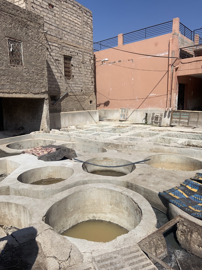 Мы, как люди которые каждый день читают про то как нагревают доверчивых туристов в разных странах, обворовывая и избивая, да и живущие в городе славящимся своими "чайными" комнатами и ряжеными конями...естественно повелись на этот развод и попёрлись за ним. Найдётся много людей которые расскажут как же плохо это могло закончиться, и они будут правы, поэтому не делайте как делали мы, дежурное -"Сенкьюверимач" и шуруйте по своим делам. Мы же проследовали за ним. Он увидев что мы идём но не особо доверчиво разговариваем с ним, начал нас успокаивать что здесь народ очень радушный и что все очень уважительно относятся к гостям, и что он с нас никаких денег не возьмёт (тут не обманул конкретно он денег не взял). Шли мы по главным улицам, где было нормальное количество людей и магазинчиков, поэтому паучье чутьё не било тревогу. Повернув с главной дороги, мы зашли в квартал берберов. В котором стало понятно что нужно разворачиваться и уходить, что мы и сказали, но оказалось мы уже пришли. Мы стояли перед большими открытыми воротами внутри которых стояли здоровенные глиняный бочки с жидкостями разного цвета (в которые и сбросили наши тела). Там стоял приветливого вида мужичок с двумя зубами на весь рот. Они перекинулись какими-то фразами и наш провожатый сказал, что это его друг и дальше он нас поведёт. Эти чаны оказались кожаными красильными.