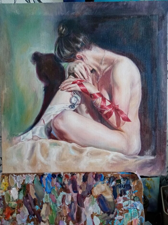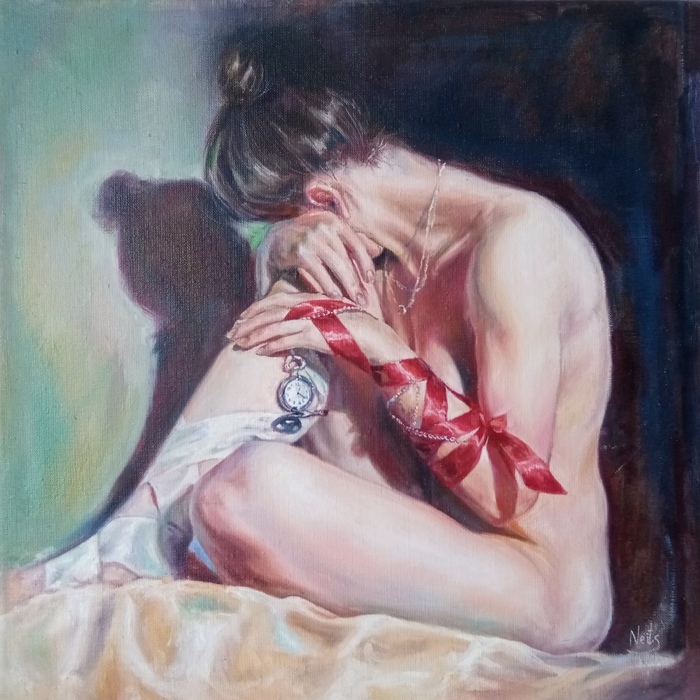 Это картина маслом на холсте 45*45 см. Да, депрессивная. Нет, это не балерина, балерины бы меня убили за такое. Картина была написала в период 10-го класса (то есть давно), и рассказывает об осознании скоротечности времени. Именно осознании, подростком, которой скоро сдавать экзамены и которая еще не знает, что она провалится при поступлении во Францию. Тогда я начала окунаться в историю тела человека и формировала свой живописный стиль. Поэтому да, все что написано, так надо. Почему обнаженка? Потому что это направленность моей художественной концепции. Обнаженное тело - честное и уязвимое. Поза специально усиливает это состояние. В моем тг-канале ещё можно долистать до этого периода (там вообще много интересного)