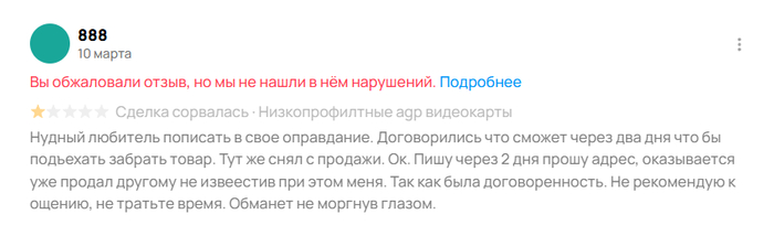 Чутьё меня не подвело и этот человек оставляет ложный отзыв на объявление про видеокарты. (Написав, что я якобы ПРОДАЛ! товар другому, ему не сообщив). Тем самым он нарушил правило №9, цитирую: "По сделке без подтверждений. Например, если мы не смогли убедиться, что продавец и покупатель заключили сделку или договаривались о ней, или что гость бронировал дом или квартиру на Авито." (Про то, что он откровенно солгал, я вообще молчу)
