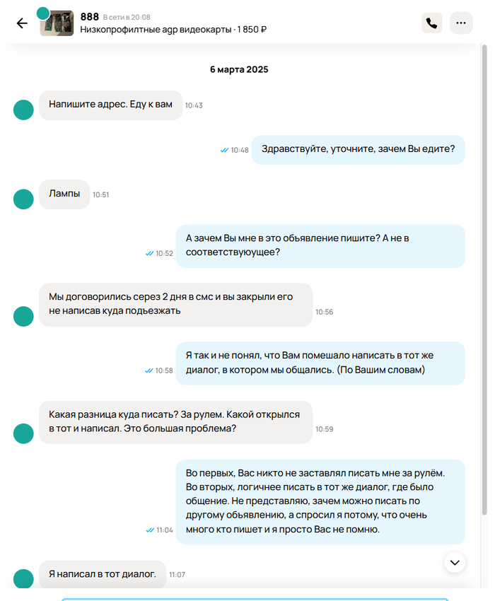 Через 4 дня, мне приходит сообщение в другое моё объявление про видеокарты "Напишите адрес. Еду к Вам", я уточняю, зачем ко мне едет человек и что вообще происходит. Как выяснилось, один из этих 10ти пишет мне про эти лампы, про которые я уже даже и забыл. Я сообразив чем пахнет дело (адекватный человек, не будет без предварительной договорённости ко мне ехать, тем более, через 4 дня, когда прошло уже столько времени, да ещё и писать при этом в другое объявление). Спрашиваю, зачем мне он пишет в другое объявление? (Делаю я это с пониманием того, что имея факт переписки, можно оставить отзыв, а адекватностью эта ситуация не пахла). Далее мы уже перешли в изначальный диалог, там я ему ответил, что лампы давно отдал. Из переписки видно, что с ним у меня не было никаких договорённостей. (Да, я к сожалению не ответил на его последнее сообщение, обычно я так не делаю, пропустил из-за большого количества желающих, но договорённостей с ним тем не менее никаких не было).