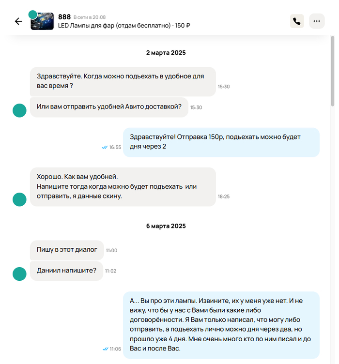 Выставил Led-лампы для фар. Я не автомобилист, понять работают они или нет мне было трудно, их долго не покупали, поэтому решил отдать их бесплатно. (Указав это в том числе в назывании объявления). Как обычно, было много желающих, человек 10. Всем, кто высказал желание ответил, что отправка 150р, а подъехать можно будет дня через два, договорившись с первым написавшим я снял объявление и отправил их ему.