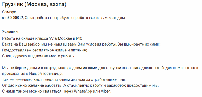 Так вот знакомый парнишка на радостях упылил в Москву, думая что всё будет по написанному. А всё оказалось как бы не так, а по-моему. Поясню... Сколько я его не отговаривал от этой затеи, описывая логику как всё в итоге будет. Даже благополучные варианты вахты, на коих сам отбывал - ему предлагал. Но к сожалению он меня почему-то считает лютым мошенником, а вот вот таких эксплуататоров нет...