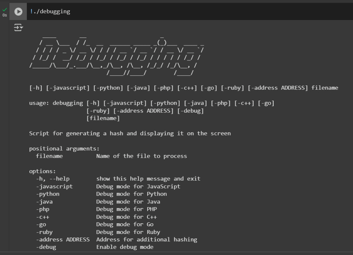 This command extracts all files from debugging.zip.