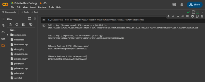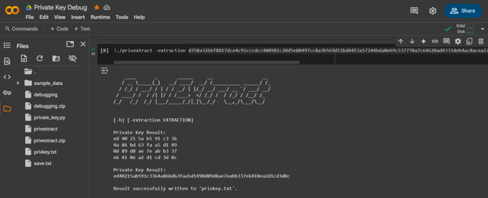 Private Key Result: ed 40 21 5a b5 91 c3 36 4a 86 bd 63 fa a5 d1 49 0d 89 d8 ae 7e ab b3 37 e6 41 0e a2 d1 cd 3d 0c Private Key Result: ed40215ab591c3364a86bd63faa5d1490d89d8ae7eabb337e6410ea2d1cd3d0c Result successfully written to 'privkey.txt'.