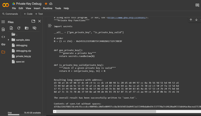 The generated private key is saved to the file save.txt without spaces.