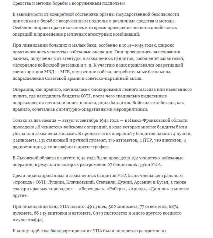 Как известно, решение практических задач по разгрому националистического подполья на Украине было возложено на органы МВД и МГБ. В органах МВД были созданы для этой цели отделы борьбы с бандитизмом. Этим же органам были подчинены внутренние войска, позже переданные в ведение МГБ. В системе органов МГБ были образованы Управление 2-Н МГБ УССР и отделы 2-Н областных управлений МГБ западных областей республики, которые были укомплектованы наиболее опытными чекистскими кадрами. В 1949 году в систему МГБ были переданы органы милиции.