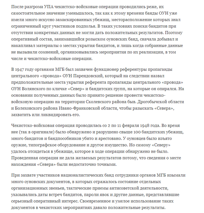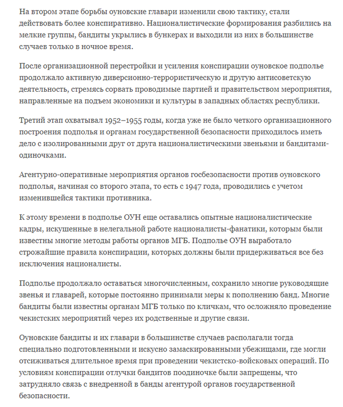 Борьба с бандитским оуновским подпольем — это героическая страница в истории органов госбезопасности. Тысячи чекистов в тяжелых условиях мужественно и самоотверженно вели борьбу с коварным врагом. Многие чекисты, сотрудники милиции, партийные и советские активисты отдали свою жизнь в борьбе с бандитами.