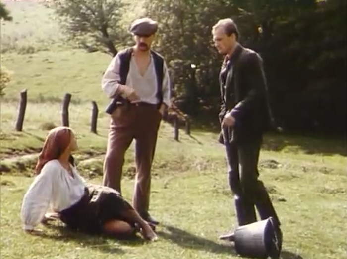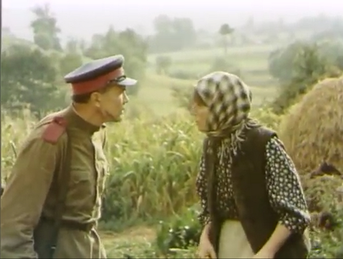 Какая то женщина, которую кстати в селе не очень то и любят, при этом называют нехорошим словом сучка, подходит к красному с оцарапанной мордой и сообщает ему, что она видела троих вышедших из леса, которые прячутся сейчас у некой Федоры, мужа которой расстреляли красные. Да, то как женщина стучит красному, незаметно так, подслушивает какой то мужик.