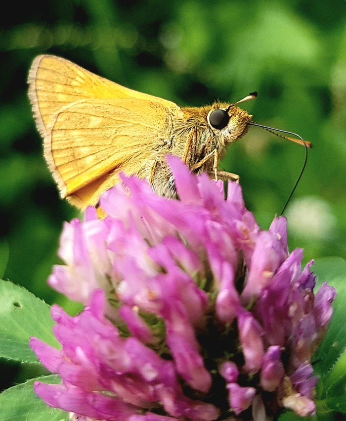 Достает нектар лесовик мощным, длинным "виниловым" хоботком с глубины цветка клевера, опыляя его.