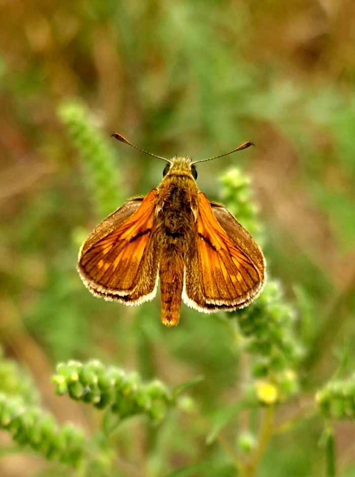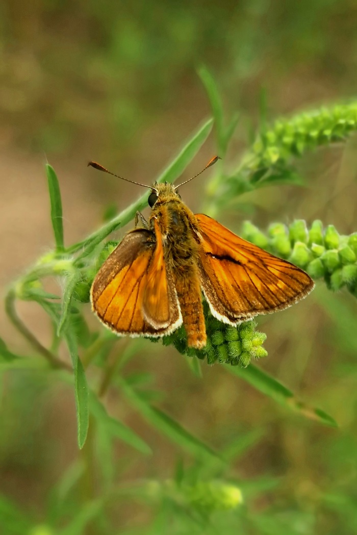 Потому, что на фото толстоголовка-лесовик, Ochlodes sylvanus. Этот вид, как и другие из семейства толстоголовок Hesperiidae, отличаются от других дневных бабочек указанными признаками. А ещё большей частотой взмахов крыльев и шумным полетом.