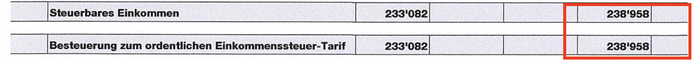 и после всех вычетов налогооблагаемый доход для расчёта кантонального и муниципального налогов составляет 226 597 франков:
