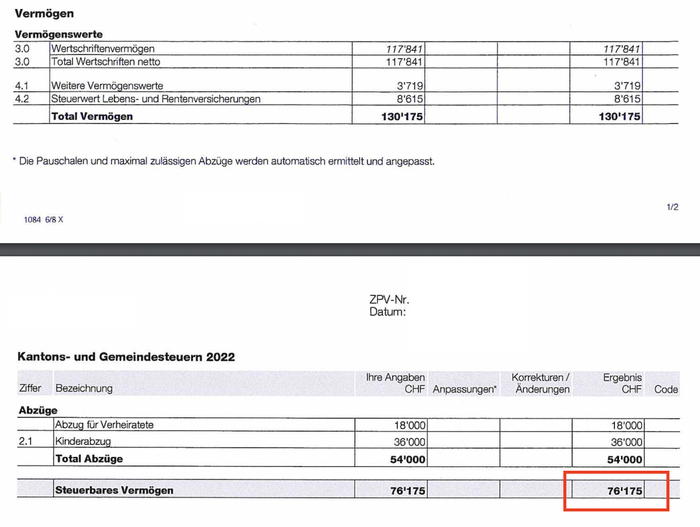 Тут же идёт расчёт имущественного налога с применением вычетов (за детей и для супругов) и тут волшебным образом имущества у меня становится меньше 100 тысяч франков (76 тыс. с копейками) и имущественный налог поэтому отпадает: