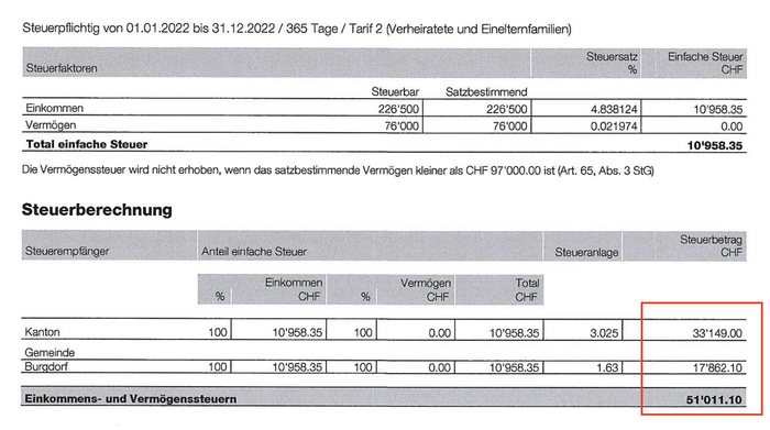 Согласно новым данным был произведён перерасчёт федерального налога, а также кантонального и муниципального налогов: