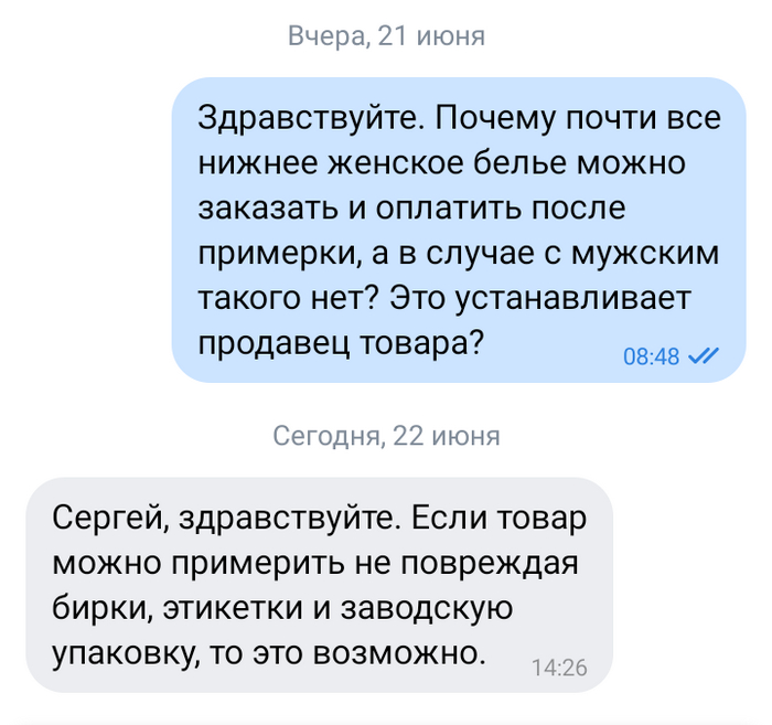 Получается, пришла свинарка с фермы на ПВЗ (хейтерам: в селах тоже есть Озон и ВБ), померила стринги, отказалась (сохранив этикетки и бирки). Ну и что, что на немытый вареник примерялось, ну и пусть пахнет навозиком...не подошли и все тут. А мужикам как обидно...не померить свои труселя.. Что купил, то и носи...