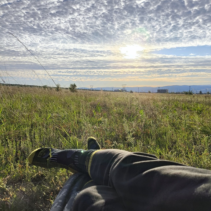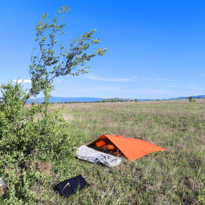 Солнце приятно греет, так что я умываюсь на колонке, пополняю запасы воды и ухожу в поля разбивать лагерь. Плюс ранней стоянки - можно зарядить телефон солнечной панелью, заодно проверив её.
