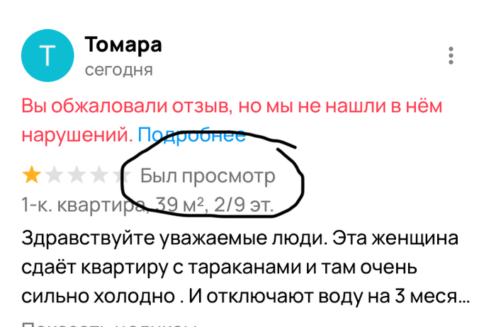 Я конечно же как разумный человек иду оспаривать эту клевету, которая кстати карается законом. Делаю много попыток, но авито считает что все в порядке. Отзывы оставлены с пометкой «был просмотр», я приложила скриншоты переписок с данными личностями, из которых видно, что просмотров не было, что написана неправда. Я прикладывала технической поддержке видео своей квартиры. Но им все равно.
