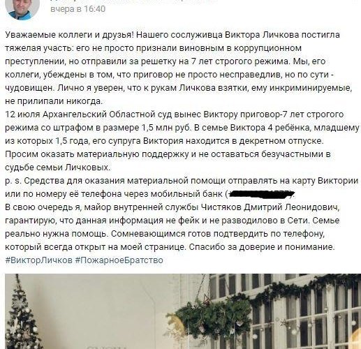 И эта история не получила бы продолжение, если бы слово не взял руководитель пресс-службы ГУ МЧС России по Архангельской области майор Дмитрий Чистяков. На странице ВКонтакте (есть все основания считать, что страница не является фейком) он написал пост в защиту осужденного Личкова.