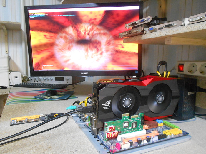 Когда-то топовая видеокарта ASUS GTX 780Ti. Пришла с прогаром двух фаз системы питания видеочипа. В итоге имеем короткое замыкание по 12В линии доп.питания и уход БП в защиту при включении.
