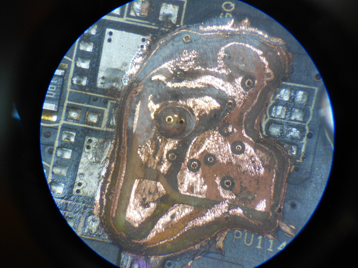 Все компоненты в районе места прогара были предварительно сняты. Само место прогара пришлось высверливать.