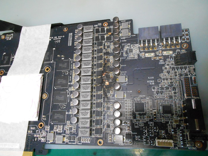 Здесь явно присутствует инженерный просчёт. Это тот самый случай, когда в топовой карте производитель не предусмотрел элементарные предохранители по 12В и именно из-за этого текстолит прогорел насквозь.