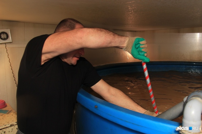 Внутри на деревянных чурбаках установлены четыре широких пластиковых резервуара, к которым подведены трубы. Периодически, вздрогнув, с шумом включается насос, который фильтрует воду, забирая из неё избыток аммония — вещества, которое выделяют рыбы. Поскольку рыба живёт в достаточно скученных условиях, воду нужно фильтровать регулярно — за этим следит автоматика.