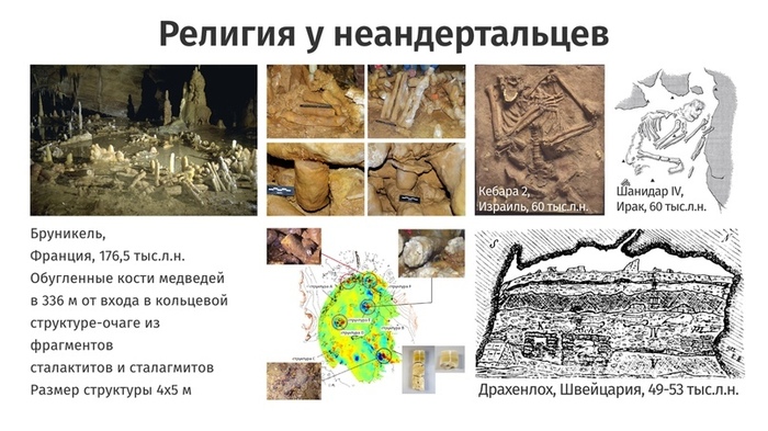 Эта «религия» у неандертальцев, по-хорошему, конечно должна ставиться в кавычки. Тут я не стал ставить, но тем не менее. Доказательств, что у них было представление о загробной жизни, о каком-то Творце, о духах, честно говоря, у нас нет. То есть, например, у неандертальцев в этих самых погребениях никогда нету внятного инвентаря, чтобы мы точно знали, что вот он там есть. Посыпки охрой, или чего-нибудь такого — нету. Причем сверху, над могилой, что-то такое может быть, а в самой могиле — нет. Так что религиозные представления неандертальцев под большим вопросом. Но что-то такое у них шевелилось. Вот как в Бруникеле, какие-то святилища они создавали, что-то такое нестандартное они делали. Значит, жили хорошо, раз было время и силы колошматить этих медведей и камни.